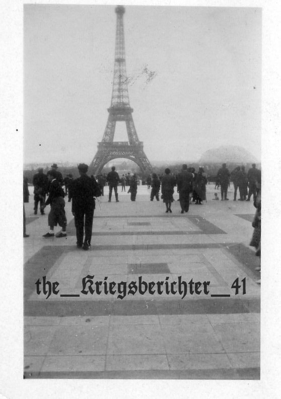 The Seventh and final photograph also shows the Eiffel Tower except this photograph is taken at a different position. The photograph here taken at a south eastern view of the Tower as the Les Invalides dome can be seen to the left in the distance. This photograph angle of the Eiffel Tower shows a more defined detail to the ironwork and cross over patter of the frame. This photograph also capturing civilians around the tower. Notably is another Soldat taking a photograph of the tower as he is seen standing looking down into the viewfinder. Seen to the left in the foreground of him, seen below the Les Invalides dome in the distance stands another group of Soldaten. Likely another group possibly from the same or different unit as they stand likely together to be taking in the sights of Paris not only admiring the stunning view of the Eiffel Tower this close up but also the Les Invalides dome in the distance.