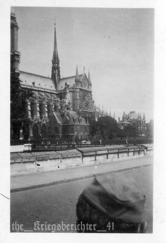 The third photograph shows Notre-Dame de Paris (Meaning Our Lady of Paris). This another historical monument in Pairs as well as France. This iconic building being seen in this photograph from a side on angle that boasts its amazingly tall and detailed central spire. The medieval Catholic church was mostly completed in 1260 and finally in 1345. Notably seeing some damage during the French Revolution in the 1790's. The iconic and large Rose Window can be seen here, this being the north facing window which was constructed in 1250, just also visible below would be the vertical window. A church being a place of worship that some may hold close to their hearts with their religion but also notable like all of the photographs of this tour to be a trophy of their occupation. The close and personal element is seen to this like the others as the amateur photographer photographs the back of one of the other Soldats head.