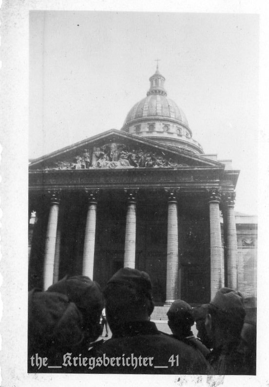 The first photograph shows us Les Invalides. Les Invalides was constructed under the order of Louis XIV in 1670. The building of Les Invalides was said to of been too large for its original purpose, this is seen in the grand scale of the build. It has 17 courts, covering a large area that many would find themselves exploring in down time like this. This photograph here focusing on the iconic dome at Les Invalides. The dome measuring 107 metres (351 ft) tall and decorated with 12.65 kilograms (27.9 lb) of gold leaf decorations. This showing the grand scale and wealth of not only Louis XIV but France. This being a reason like many to visit and be photographed. Boasting as a trophy of their occupation and something to celebrate around. Seen photographed here by one Soldat in his group as they explore the grounds as they walk towards the dome. Showing the personal element to this photograph group, they are seen wearing M36 tunics, M38 side caps and some are seen with bayonets whilst towards the front a NCO or officer can be seen wearing a Pistol holster on their belt. Also notable is the belt hooks that can be seen reflecting off of the light slightly. Being an amateur photographer they have still focused the camera to capture the detailed architecture.