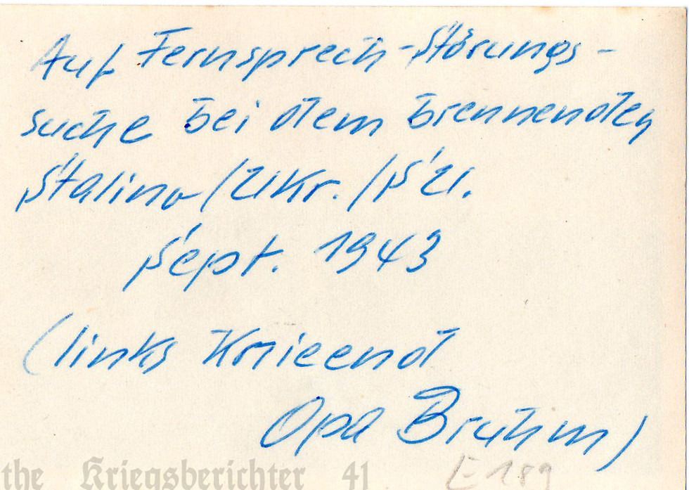 he Soviet advance. The Wehrmacht pulled out of the city in that month. The reverse (As attached) translates to, " On Radio disorder search at the burning Stalino September 1943 Kneeing on the left, grandfather Bruhm".