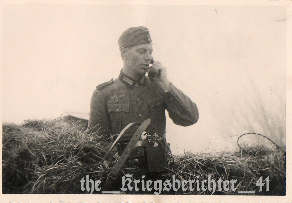 The reverse helps us understand that Bruhm is involved in the withdraw and are in communications with the "Cut and Burn" tactics used by the Wehrmacht when withdrawing from the east as a destructive withdraw in Operation Barbarossa. The Funker on the left is notably detailed on the left as Grandfather Bruhm. The other Funker on the right in the photograph with Bruhm is an Obergefreiter and he is also seen in the second photograph. The Obergefreiter is seen operating a field telephone whilst the other looks out to the distance. Both are seen wearing M40 tunics, the Obergefreiter is seen with a double chevron and Funker trade patch on his left arm.