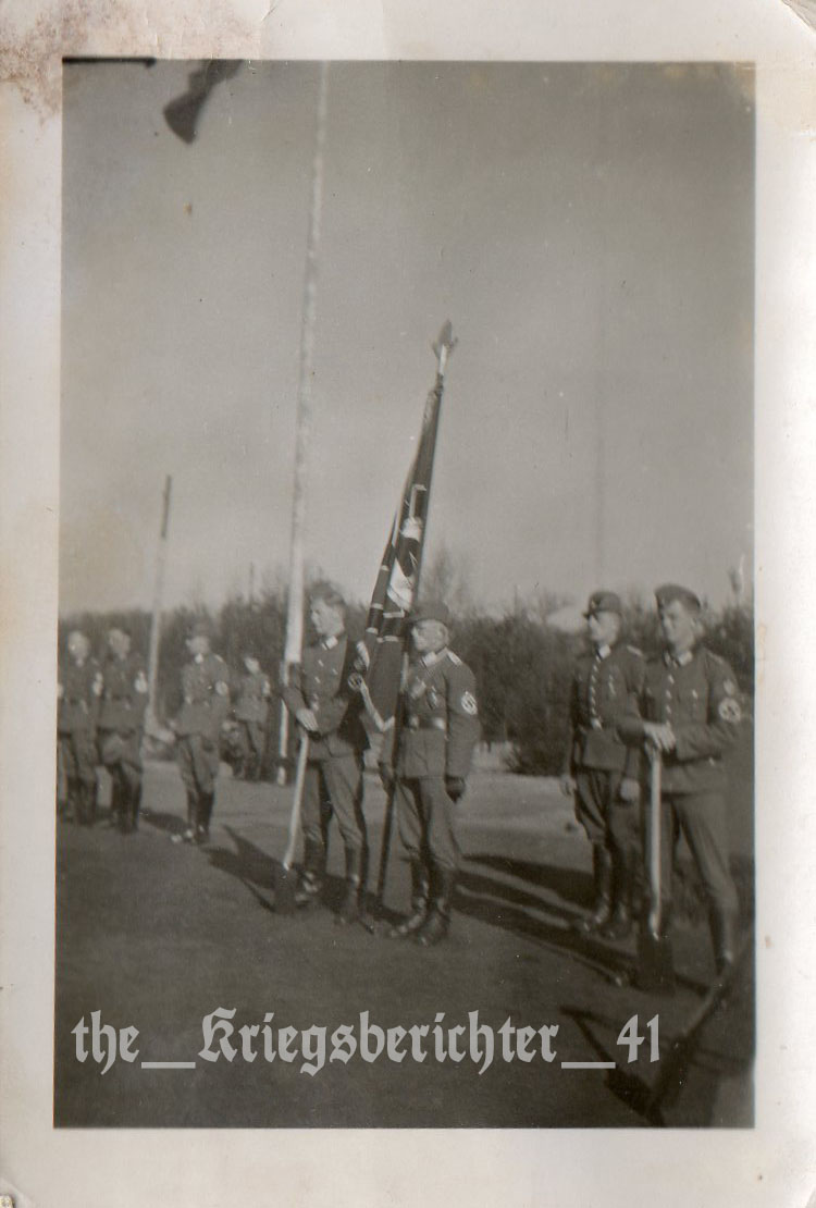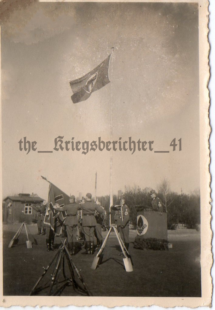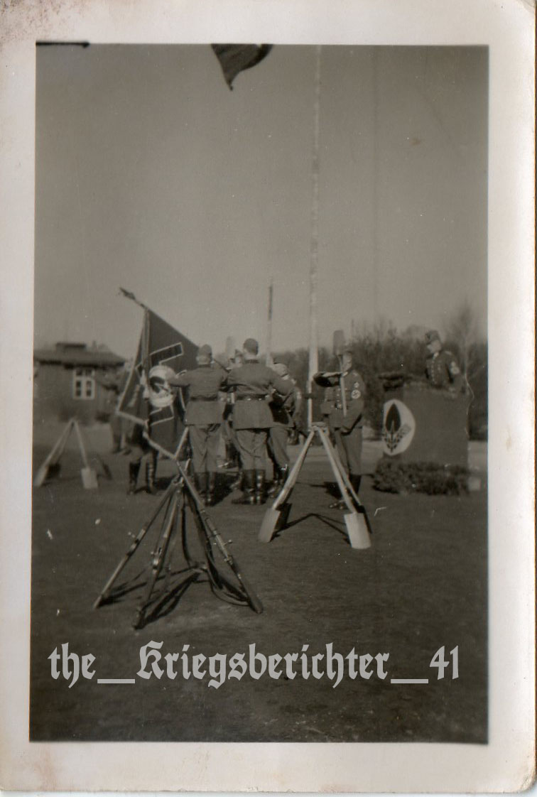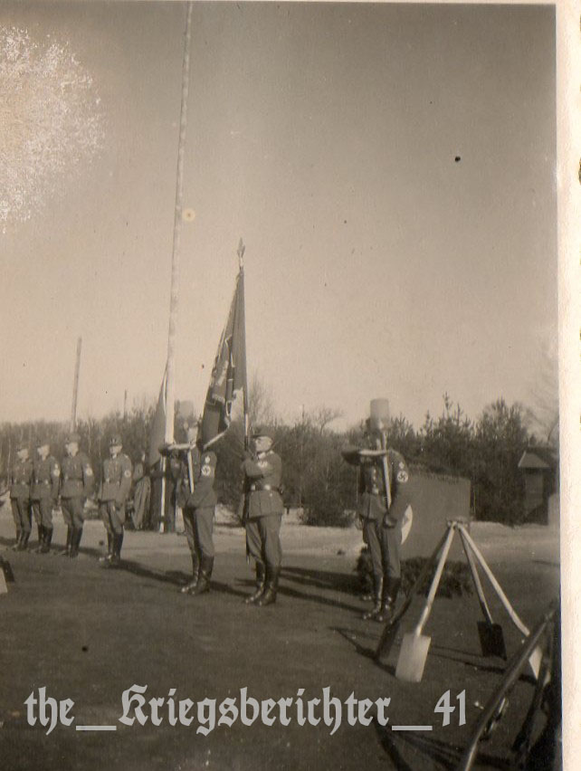 The third photograph shows the podium from the first photograph, it shows the flag bearer and other RAD men seen either side of him, the flag can just be seen in shot too. Seen at attention and the shovels seen presented in front of them. The fourth picture here shows the flag lowered again but is prior to the swearing in with the RAD leader seen saluting behind them.